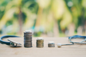 Close,Up,Stack,Of,Coin,,Medicine,Tablet,And,Stethoscope,On